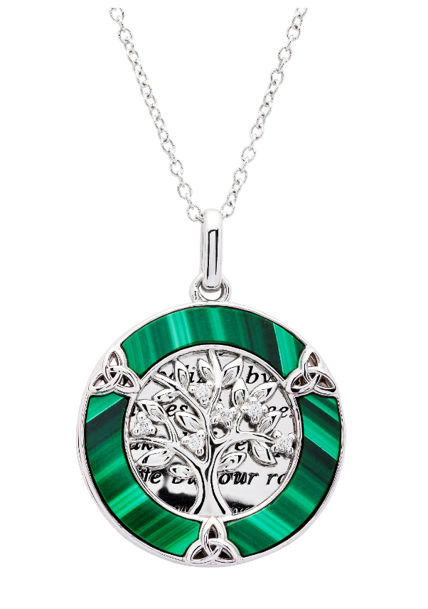 Take this symbol of family with you wherever you go when wearing this stunning necklace from ShanOre. The Tree of Life surrounded by beautiful deep green malachite and Trinity knots sits atop a sterling silver disc with the phrase "Family is symbolized by the branches of a tree. We all take different paths in life but our roots keep us together."